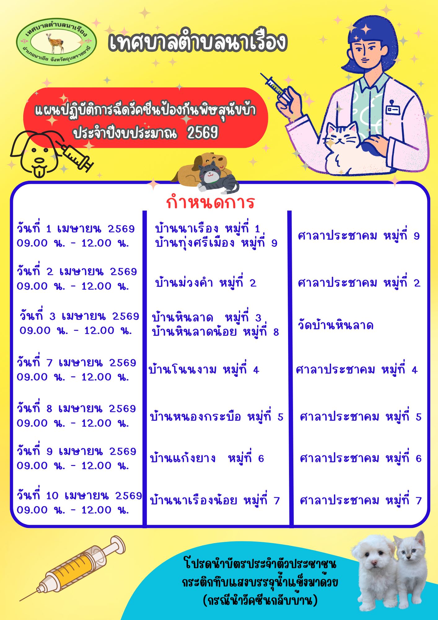 วันอังคาร, 24 มีนาคม 2569 08:54เทศบาลตำบลนาเรือง ได้จัดทำโครงการฉีดวัคซีนป้องกันโรคพิษสุนัขบ้า ภายใต้ “โครงการสัตว์ปลอดปลอดโรค คนปลอดภัย จากโรคพิษสุนัขบ้า ตามพระปณิธานศาสตราจารย์ ดร.พระเจ้าน้องนางเธอ เจ้าฟ้าจุฬาภรณวลัยลักษณ์ อัครราชกุมารี กรมพระศรีสวางควัฒนวรขัติยราชนารี” ประจำปีงบประมาณ พ.ศ. 2569