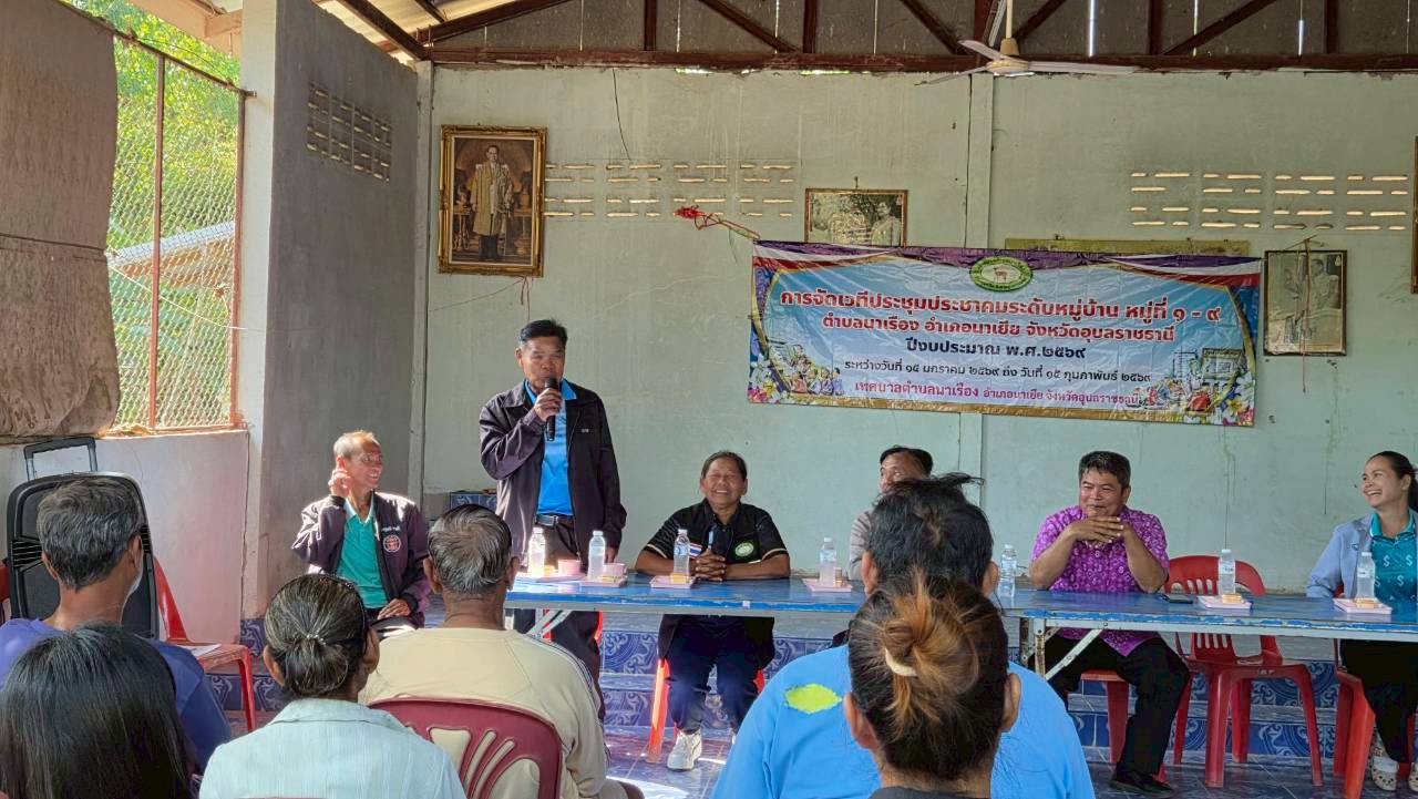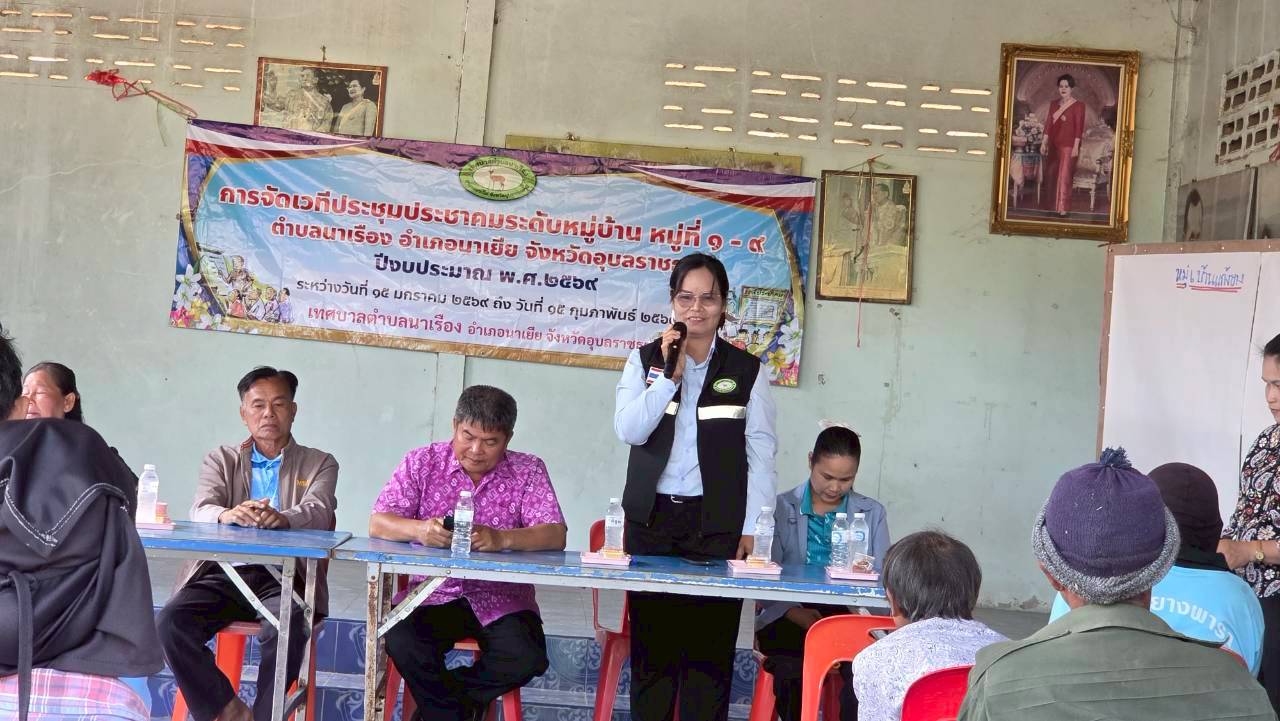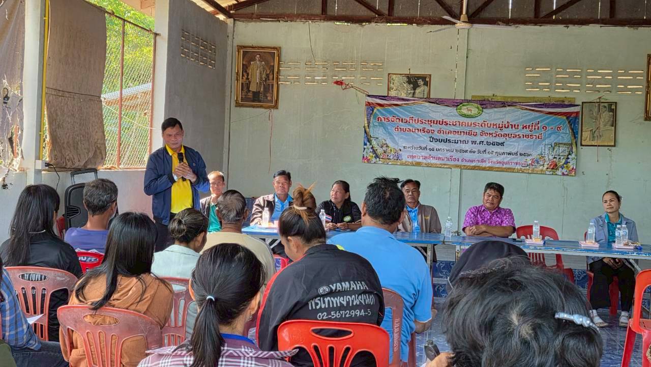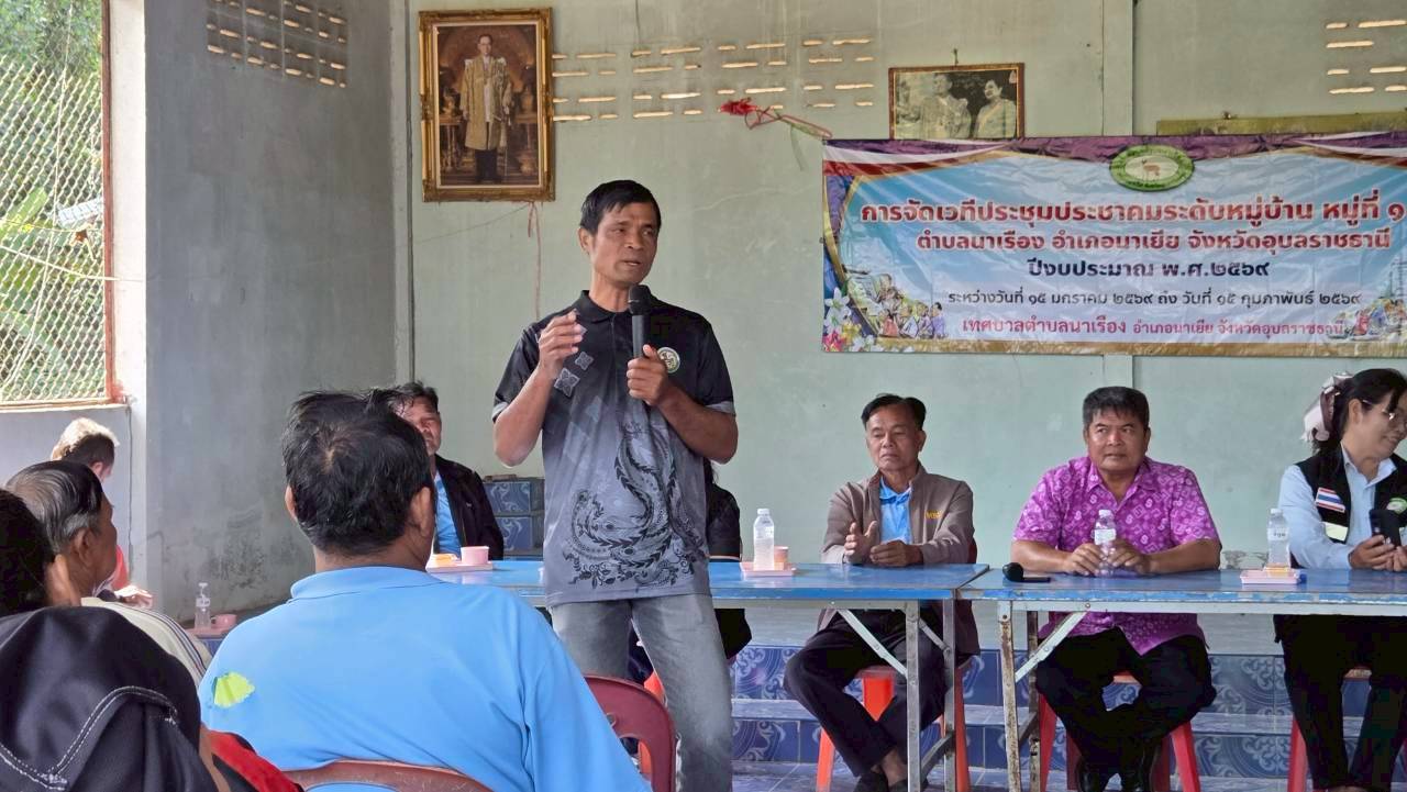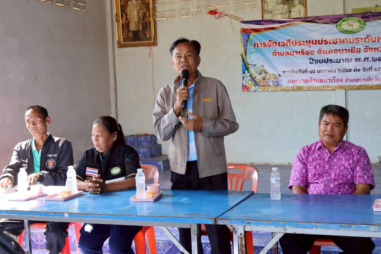 เวทีประชุมประชาคมระดับหมู่บ้าน หมู่ที่ 6 บ้านแก้งยาง ตำบลนาเรือง อำเภอนาเยีย จังหวัดอุบลราชธานี