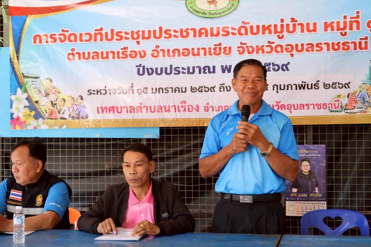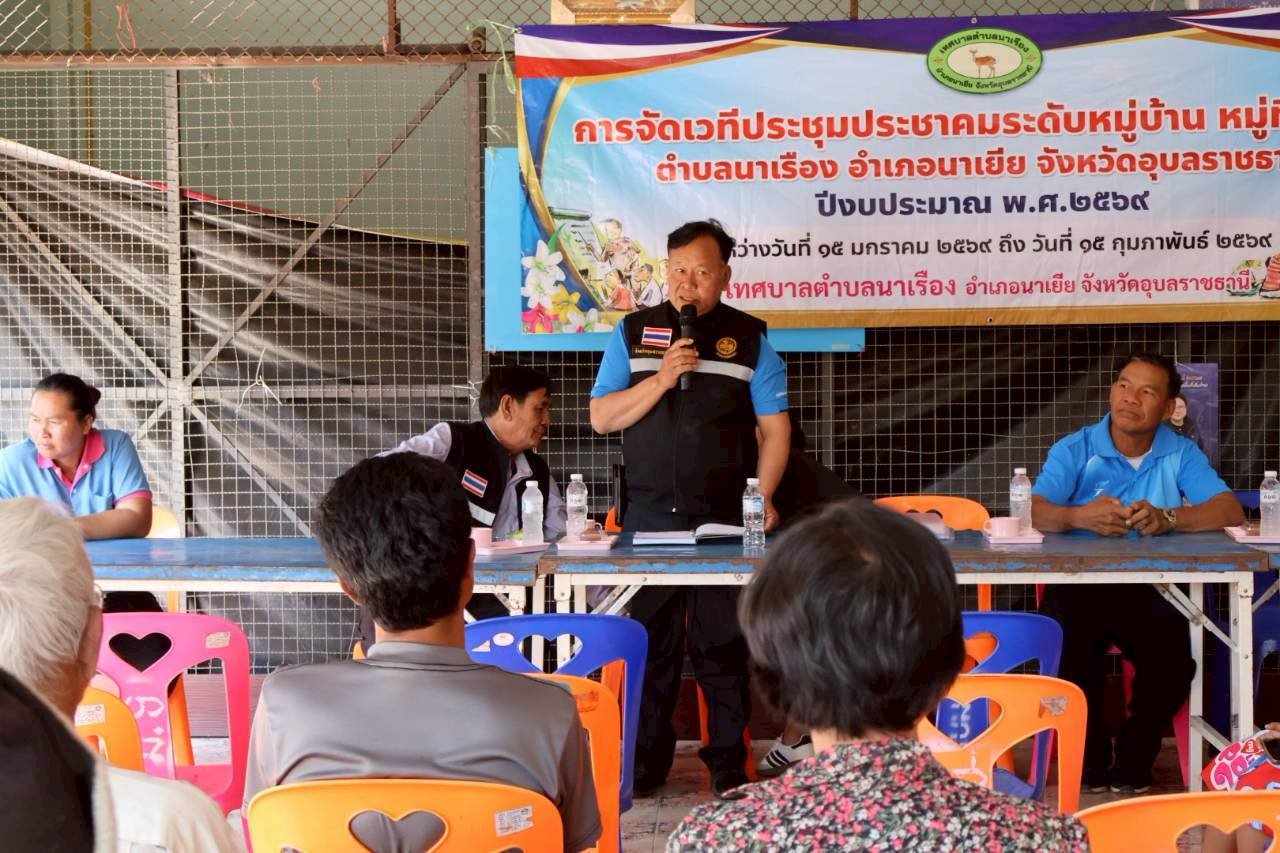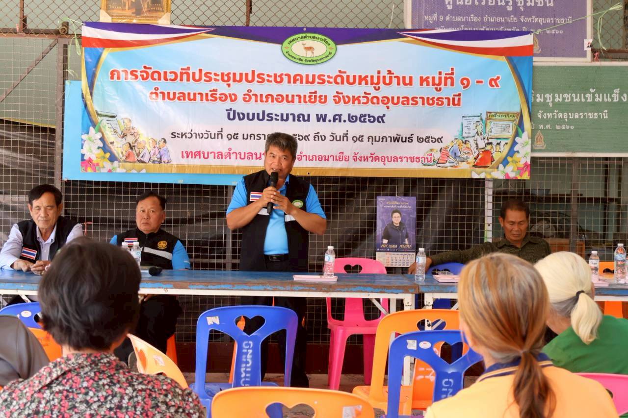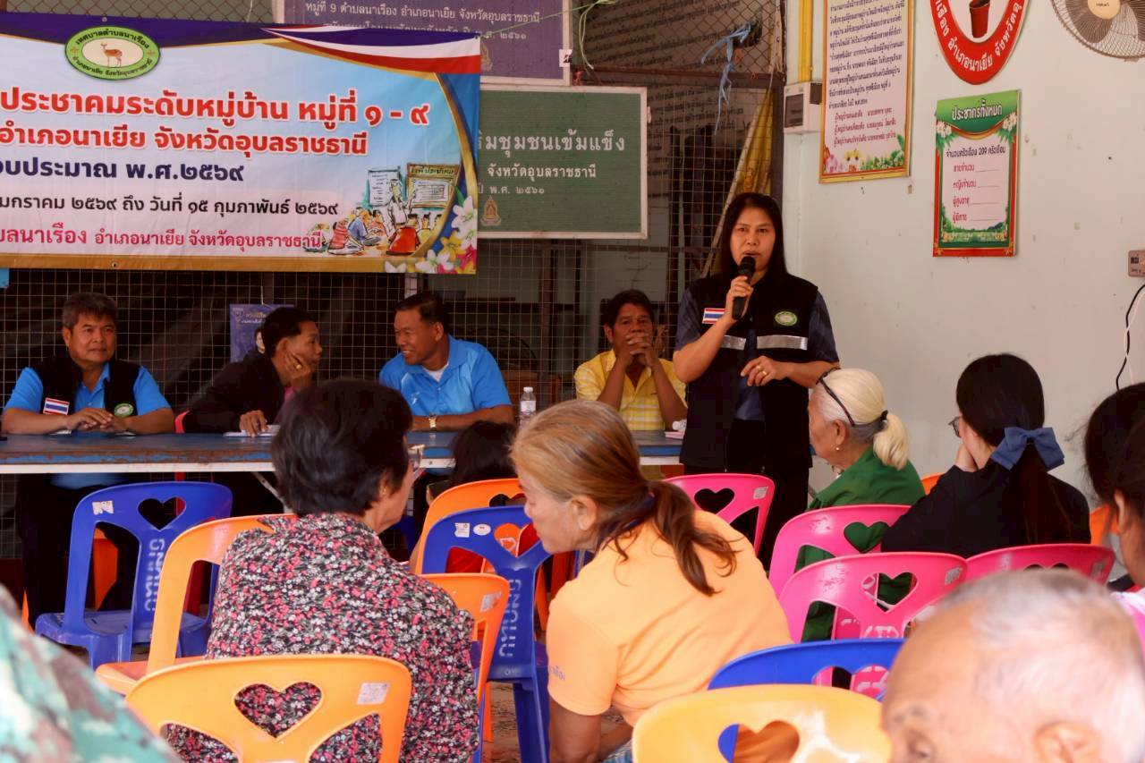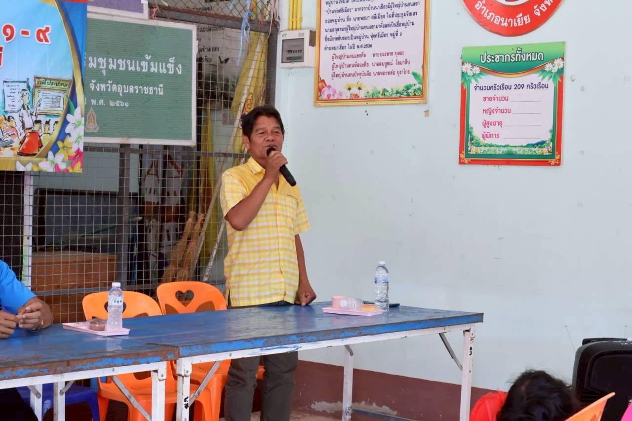 เวทีประชุมประชาคมระดับหมู่บ้าน หมู่ที่ 9 บ้านทุ่งศรีเมือง ตำบลนาเรือง อำเภอนาเยีย จังหวัดอุบลราชธานี