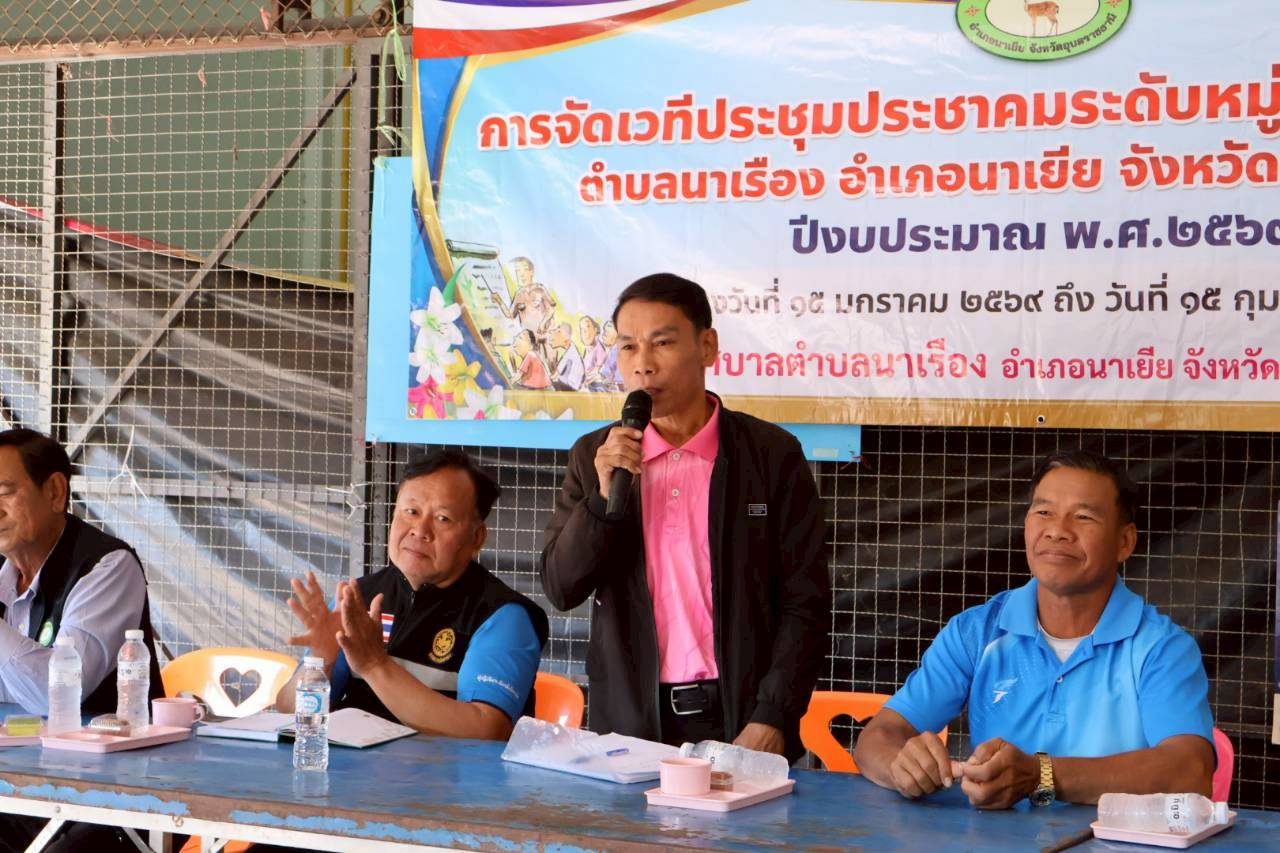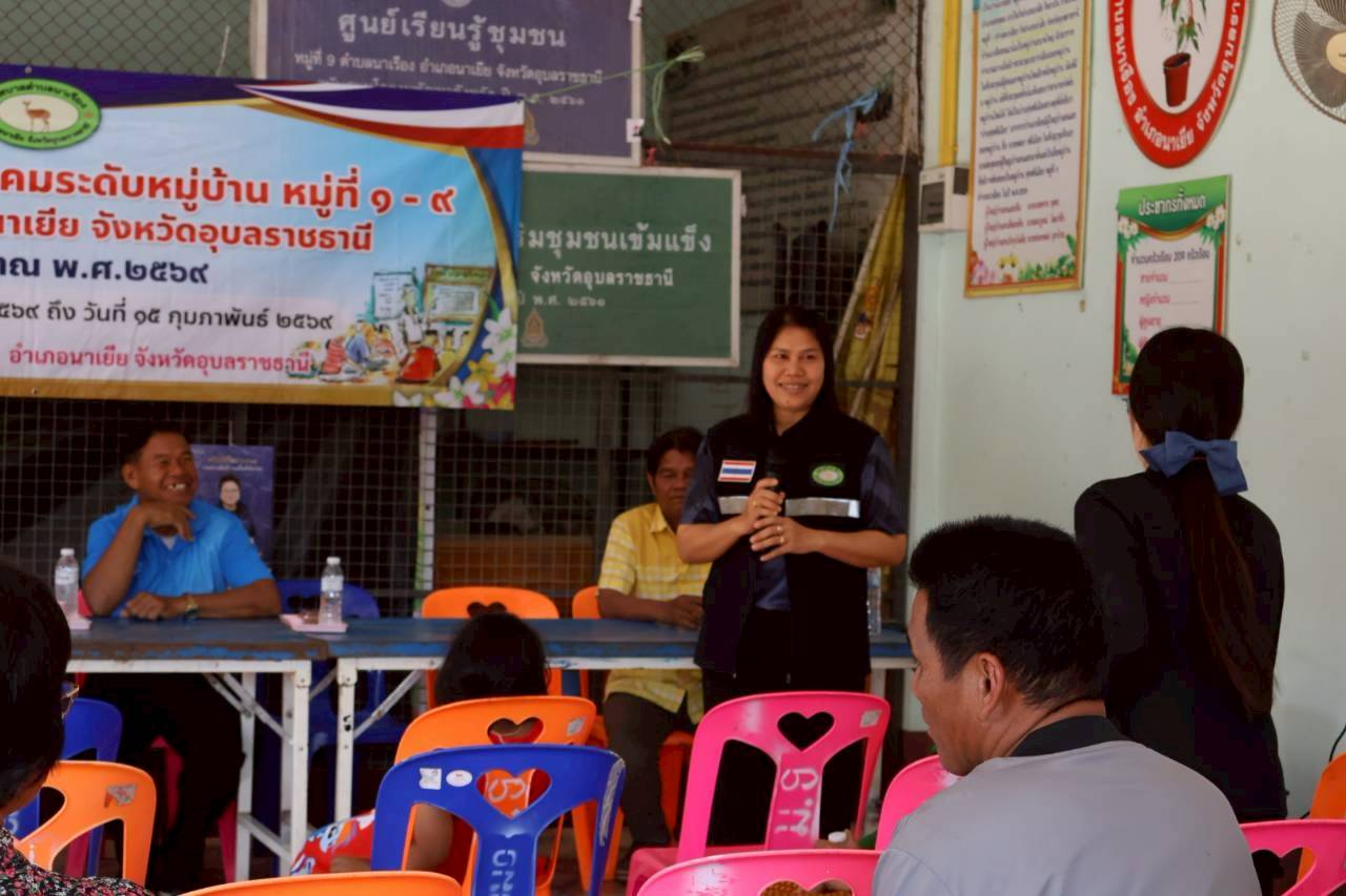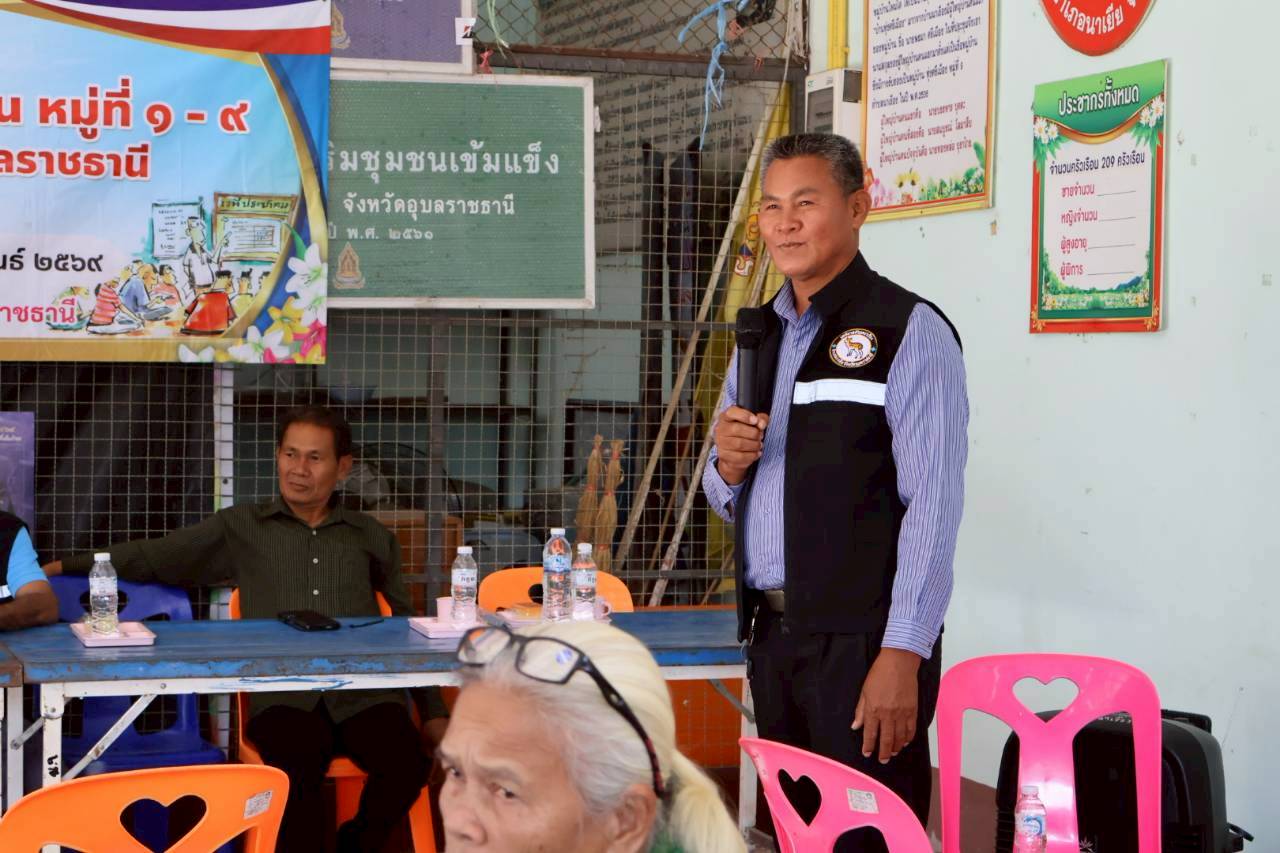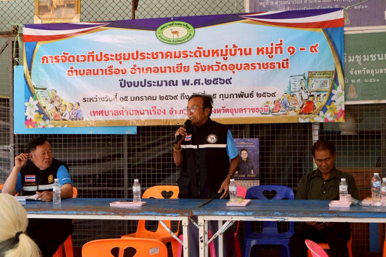 เวทีประชุมประชาคมระดับหมู่บ้าน หมู่ที่ 9 บ้านทุ่งศรีเมือง ตำบลนาเรือง อำเภอนาเยีย จังหวัดอุบลราชธานี